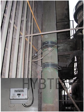 实施方案 经多方咨询考察,从技术、使用维护、费用等多方面考虑后,决定采用净元广谱感应水处理器。于2005年6月18日在1#高炉冷却系统外径377mm主供水管道上安装一套净元。 效果评价 至9月18日运行3个月,通过水质化验及冷却壁回水槽上加装的挂片试验,证明其有明显防垢效果。安装净元后第一个月停加阻垢剂、新装净元刚运行时输出电流设定为1325mA,挂片上有明显结垢现象,随后我们将输出电流增大到2350mA,并增加一个新挂片;第二个月新增挂片无结垢,旧挂片上的垢开始减少;第三个月新增挂片无结垢,且旧挂片上的垢已消失。到12月为止所有挂片上没有任何结垢现象,且原来冷却壁回水管中的垢也逐渐消失。经过以上实验,证明该设备不仅能够阻垢,而且还能除垢。(使用净元前后回水管结垢情况对比见下图A、图B) 安装净元前,该1#高炉冷却循环水系统的冷却塔处,长期存在苔藓,在夏季每个月,都要由工人用铲子进行清除。安装净元后的这6个月里,苔藓数量不但没有增加,反而比以前少了,且再没用人工清理苔藓,表明净元抑制菌藻效果很明显。到06年12月净元已连续运行18个月,运行良好。 |