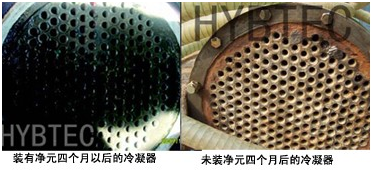 某中药制药公司中央空调系统每年运行时间从五月初到十一月中旬,由于水质硬度较高,中央空调系统冷凝器内部结垢情况严重,在制冷过程中每个月都要将冷凝器拆开进行人工清洗(酸洗、用毛铜刷洗冷凝管内壁的水垢及黏泥),且效果并不理想。