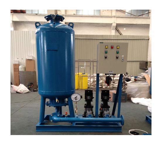 压力罐气室按充入工艺需要压力的氮气,装置连接系统, 安装完毕,打开本装置与系统之间的阀门。当系统水的容积膨胀或者收缩时,由压力罐自行吸入或吐出,使系统压力稳定在设定的压力区间内。如系统压力低于最小值时,稳压泵自动启动,向系统补水,至系统压力达到最大值时停止。若系统压力超过最大值时,安全阀自动泄压。